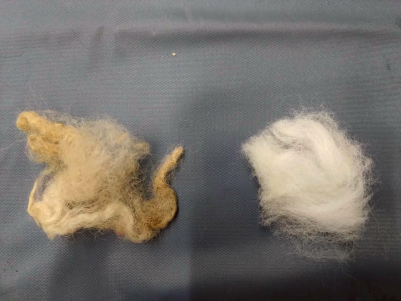 洗う前の羊毛と洗った後の羊毛を見せてもらって、においもかいで、
