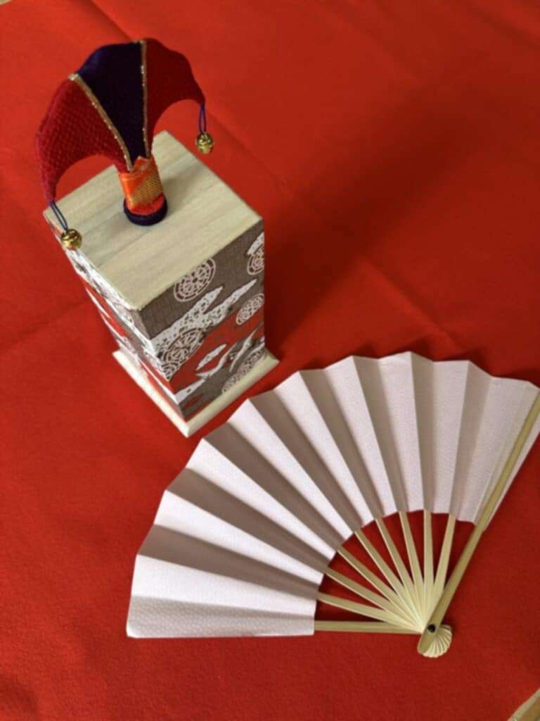 枕と呼ばれる台の上に置いた的(蝶)へ向けて1m離れた場所から開いた扇を投げ、扇・的・枕の落ちた形や位置(落ちた形に『源氏物語』の帖名や『百人一首』にちなんだ名称(銘)が付けられている)によって芸術的な落ち方で得点を競う、優雅かつ競技性の高い遊びです。