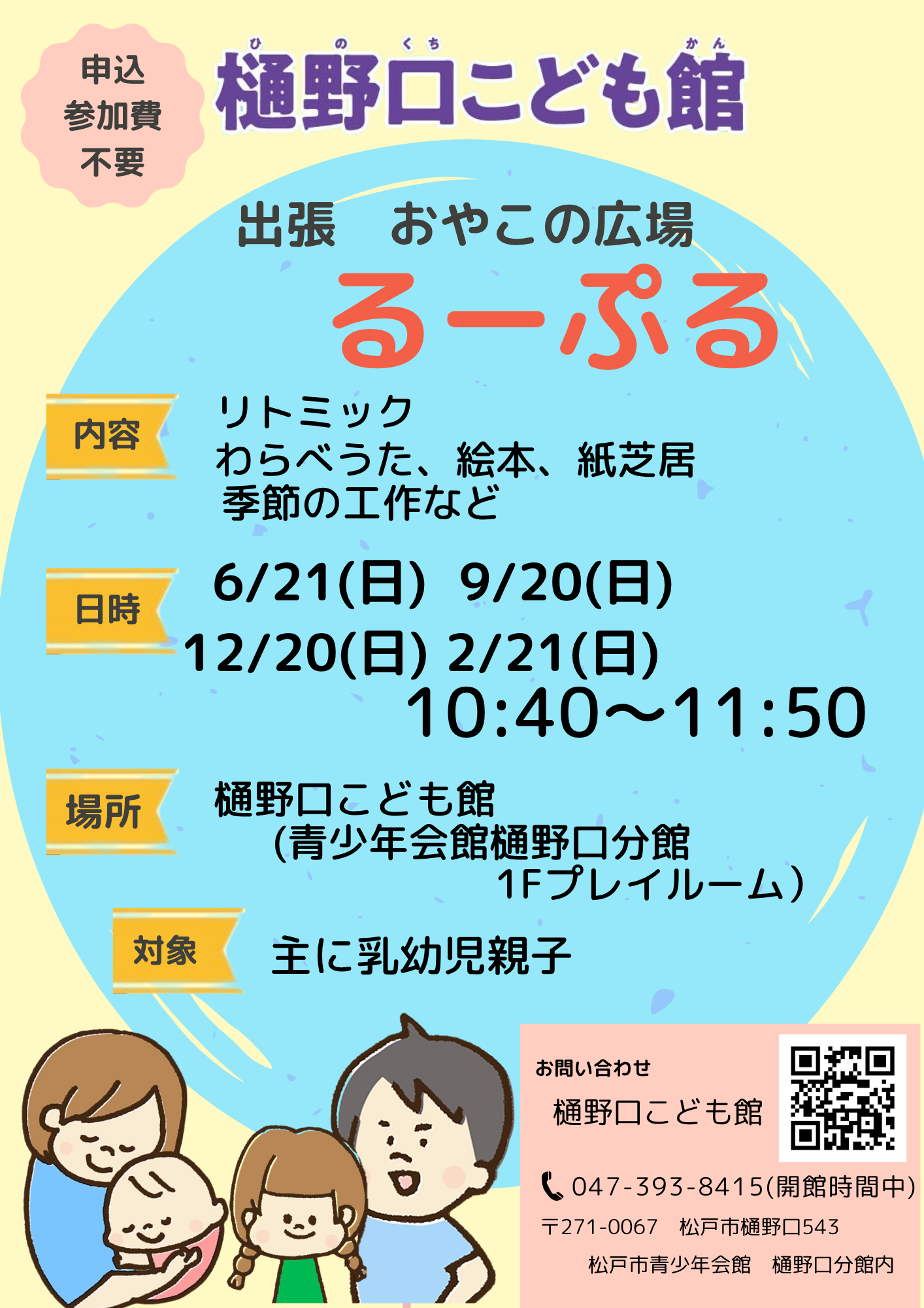 2026年度の出張おやこの広場るーぷる 2026年4月15日 お知らせ 2026年度のるーぷるのお知らせです 内容:リトミック・わらべうた・絵本・紙芝居・季節の工作など 場所:樋野口こども館(青少年会館樋野口分館 プレイルーム) 日時:6月21日(日)・9月20日(日)・12月20日(日)・2月21日(日)いずれもAM10:40-11:50 対象:主に乳幼児親子 予約・参加費はいりません ぜひ遊びに来てくださいね♪ FacebookXBlueskyHatenaCopy
