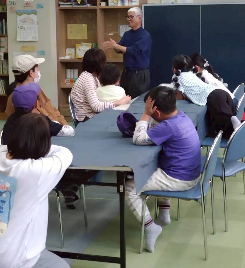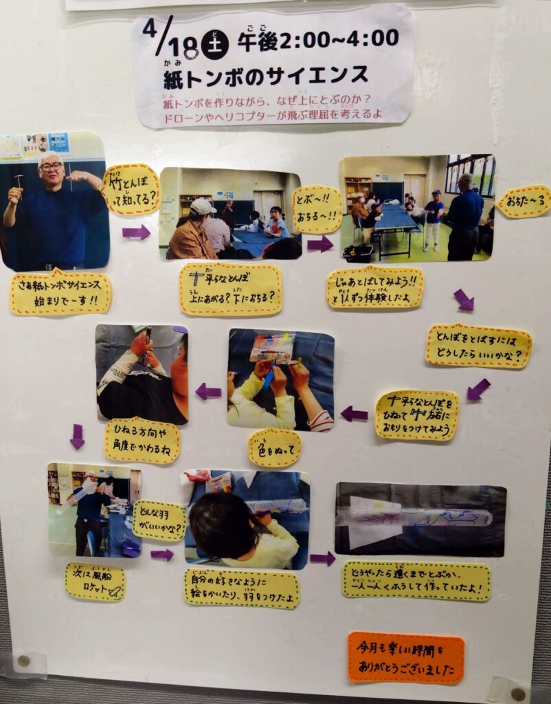 紙トンボを作りながら、なぜ上に飛ぶのか、ドローンやヘリコプターが飛ぶ理屈を考えました。